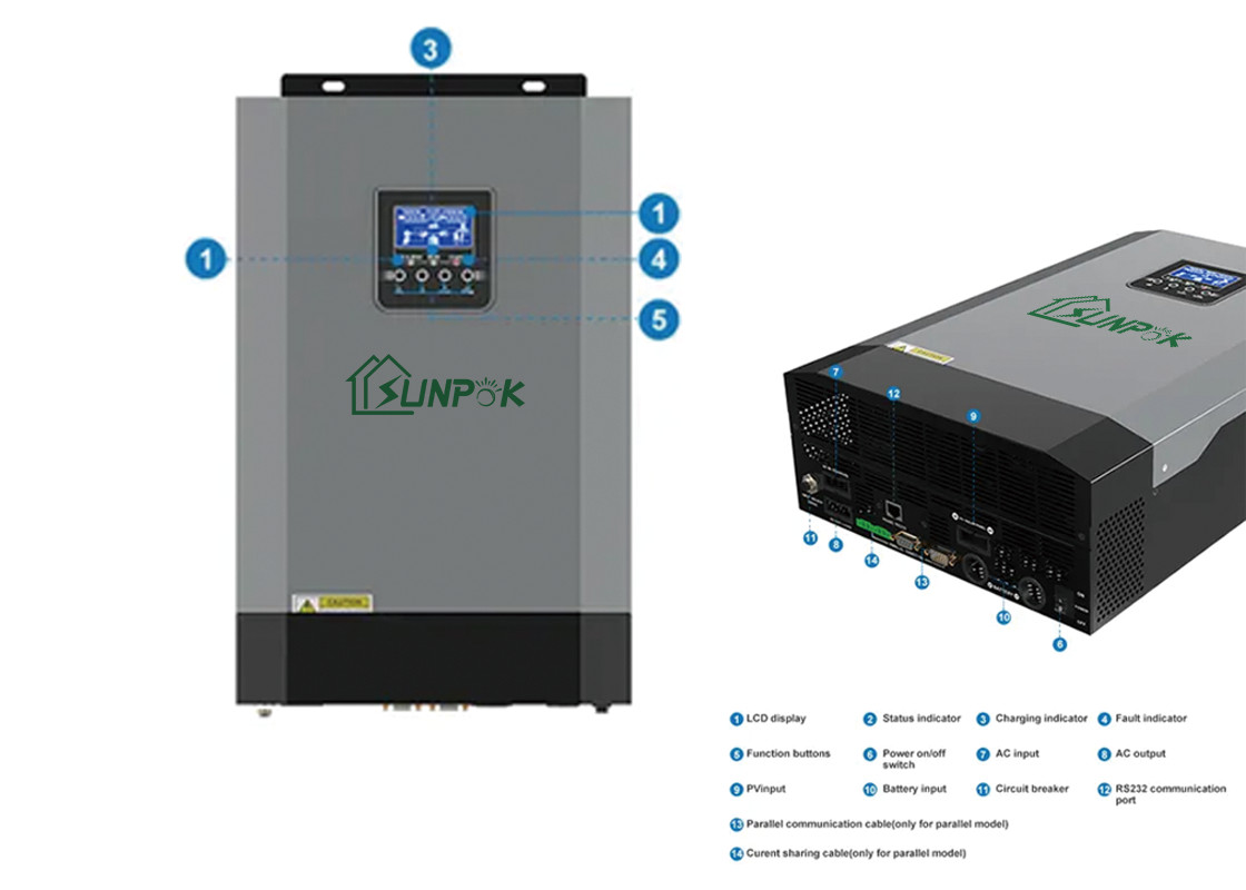 Sunpok 5Kw tek fazlı yüksek frekanslı şebekeden bağımsız invertör, güç olmayan alanlar, göçebe alanlar, iletişim baz istasyonları, gücün dengesiz olduğu alanlar, adalar, sınır karakolları, doğal yönetim ofisleri, gazete bayileri, pil üreticileri için pil paketleri vb. için uygundur. LED ekrana sahip, USB/RS232/RS485/Bluetooth/Kuru kontak, kompakt tasarım ve yüksek maliyetli performansı destekler.